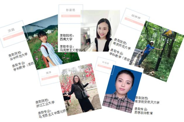 近年來,學院涌現了一批優秀學子。他們榮獲共青團中央“踐行社會主義核心價值觀先進個人”、省優秀學生干部、省社會實踐先進個人、省優秀畢業生、國家獎學金等榮譽,共有30人次參加了校級以上的各類學科競賽,其中一名學生獲得全國性學術論壇征文三等獎,三名學生分別獲得浙江省師范生技能比賽二等獎、三等獎和優秀獎,參加教師資格證考試合格率達90%,遠高于全國和浙江省平均水平。本專業學生考研率也急劇攀升,2017屆我院報考率21.11%,錄取率73.68%,占畢業總人數15.56%。歷年考研錄取院校涵蓋了包括華東師范大學、西南大學、華中師范大學、南京航空航天大學、南京師范大學等“985”、“211”高校在內的10余所高校。