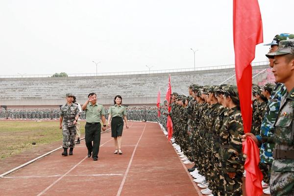 金佩華在軍訓(xùn)團(tuán)相關(guān)負(fù)責(zé)人陪同下檢閱各方陣訓(xùn)練成果。同學(xué)們眼神堅(jiān)定,身姿挺拔,以洪亮的口號(hào)回應(yīng)金書記的親切問候。