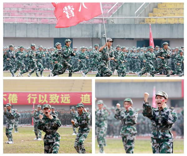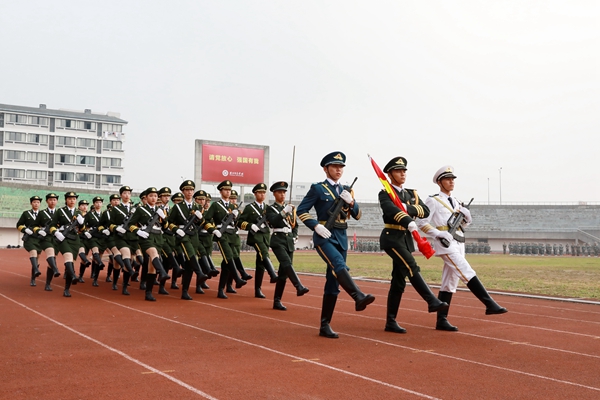 升國(guó)旗,奏國(guó)歌,行注目禮。運(yùn)動(dòng)場(chǎng)上五星紅旗迎風(fēng)飄揚(yáng),雄壯的國(guó)歌聲振奮人心,軍訓(xùn)匯報(bào)表演拉開帷幕。見習(xí)同學(xué)組成的合唱團(tuán)學(xué)生用整齊嘹亮的歌聲展現(xiàn)出當(dāng)代青年學(xué)生的時(shí)代風(fēng)采。“請(qǐng)黨放心,強(qiáng)國(guó)有我…”鏗鏘有力的呼喊聲此起彼伏,久久回蕩在風(fēng)雨操場(chǎng)。