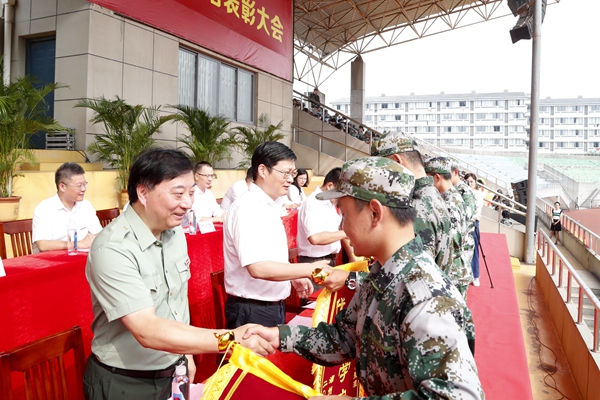 舒志定宣讀軍訓(xùn)表彰文件,主席臺(tái)領(lǐng)導(dǎo)為軍訓(xùn)先進(jìn)集體和個(gè)人進(jìn)行頒獎(jiǎng)。