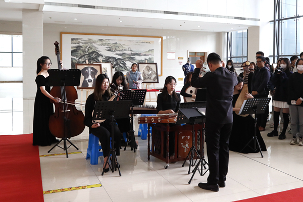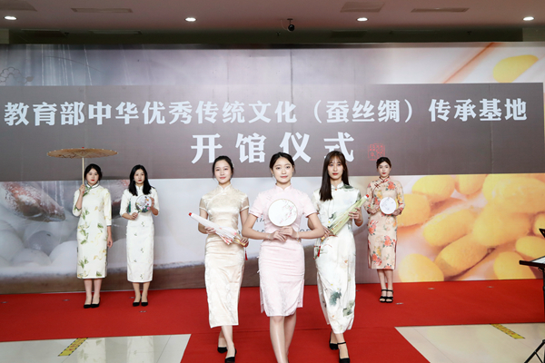 儀式在蠶花藝術(shù)團(tuán)演奏樂曲《蠶桑舞》和校絲綢文化旗袍大使走秀表演《絲韻江南》中拉開帷幕。