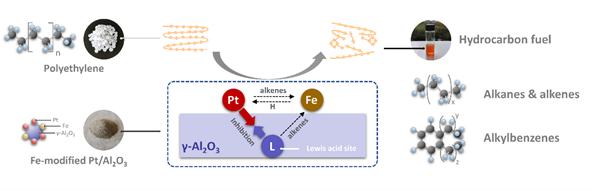 廢塑料液化制取燃料是廢塑料資源化回收的重要途徑,也是我國“雙碳”背景下低碳循環發展的迫切需求。但傳統催化熱解溫度較高,易造成催化劑積炭失活及低值烴類氣體產生。加氫液化雖然溫度較低,但原料H2制造成本高、能耗大。針對這些問題,陳澤洲博士構建了一種Fe修飾的Pt/Al2O3催化劑,通過催化劑上Fe、Pt以及Al2O3三種活性位的串聯催化作用,調控聚乙烯(PE)自身發生原位H轉移,從而替代外源H2實現對PE的低溫液化制取燃料。研究結果顯示,經Fe修飾后的Pt/Al2O3催化劑不僅可在低溫(330℃)、無氫條件下將PE有效液化為以長鏈烷烴為主的燃油組分,并且具有很高的再生活性。研究同時還揭示了串聯催化體系中不同催化活性位之間的相互作用機制。本研究成果結合了催化熱解和加氫液化兩種廢塑料制取燃料方法的優點,可顯著降低廢塑料制取燃料過程的能耗,有望在未來的廢塑料資源化轉化中得到應用。
