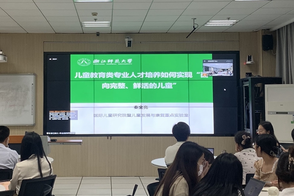 近日,教育部人文社科重點研究基地北京師范大學教師教育研究中心長三角分中心、教師教育學院開啟湖州師范學院太湖品學教師教育學科前沿論壇系列第三講“兒童教育類專業人才培養如何實現‘面向完整、鮮活的兒童’”。主講嘉賓為浙江師范大學國際兒童研究院院長暨兒童發展與康復重點實驗室主任、中加人類發展聯合實驗室中方執行主任、中國學前教育研究會理事長秦金亮教授。副校長舒志定主持講座。講座采用線上線下相結合的方式,200余名老師同學參加了講座。