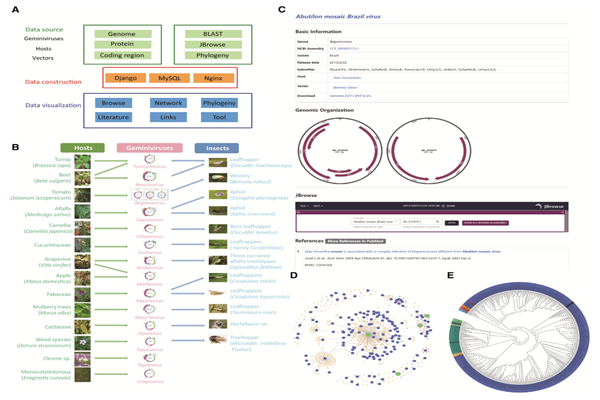 3)“Phylogeny”:基于雙生病毒全基因組序列比對(duì),構(gòu)建了目前最為全面的雙生病毒科的系統(tǒng)發(fā)育關(guān)系;