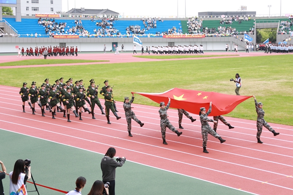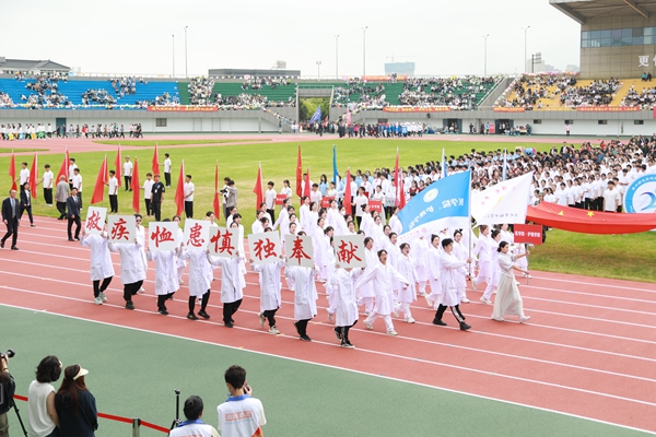 伴隨著雄壯的《運動員進行曲》,國旗護衛隊、校運動會會徽隊以及全體裁判員、運動員邁著整齊的步伐,精神飽滿地步入運動場。各代表隊的隊列方陣依次走過主席臺前,向師生們展現了各學院的靚麗風采。