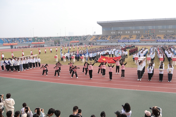 伴隨著雄壯的《運動員進行曲》,國旗護衛(wèi)隊、校運動會會徽隊以及全體裁判員、運動員邁著整齊的步伐,精神飽滿地步入運動場。各代表隊的方陣依次走過主席臺前,向師生們展現(xiàn)著青春風采。