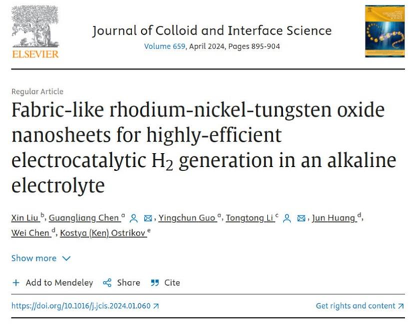 近日,我校工學(xué)院材料科學(xué)與工程系陳光良教授(第一通訊作者)以我校為第一單位在化學(xué)領(lǐng)域知名期刊《Journal of Colloid and Interface Science》(中科院一區(qū)TOP,IF:9.9)上,發(fā)表題為 “Fabric-like rhodium-nickel-tungsten oxide nanosheets for highly-efficient electrocatalytic H2 generation in an alkaline electrolyte” 的研究文章。