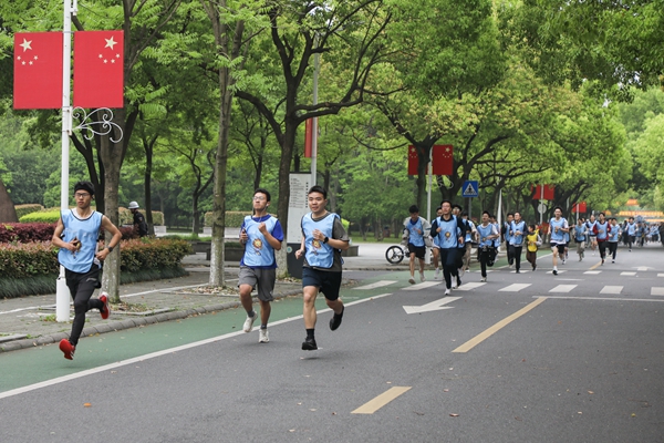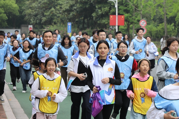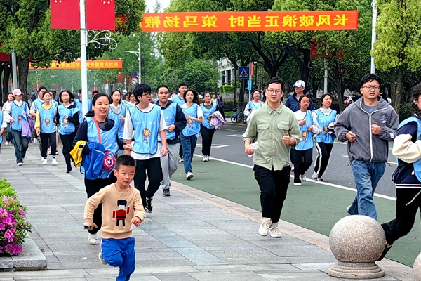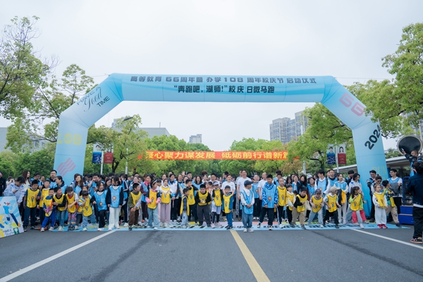 儀式結束后,陳永華宣布“奔跑吧,湖師!”。現場66組校友親子和1500余名師生從恩澤碑出發,沿明達路途經時光隧道、校訓廣場、數字圖書館、南潯河、德清湖畔等站點至東校區操場,攜手前進享奔跑樂趣,用奔跑展望學校更加輝煌的明天。