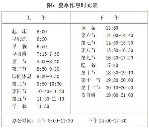 根據(jù)學(xué)校作息時間安排,自5月6日(星期一)開始實行夏季作息時間表,請各單位做好通知工作,確保調(diào)整作息時間后學(xué)校各項工作正常有序開展。