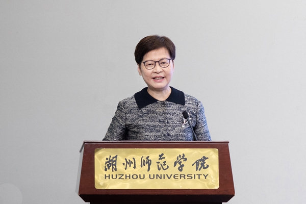 4月28日上午,香港特別行政區第五任行政長官林鄭月娥女士到訪我校,作專題報告并與師生代表互動交流。湖州市委常委、統戰部部長潘友明,全國政協委員、香港浙江省同鄉會聯合會會長詹洪良,浙江省政協委員、香港浙江省同鄉會聯合會常務副會長、湖州旅港同鄉會會長顧偉誠,浙江省政協委員、香港浙江省同鄉會聯合會副會長、香港嘉興同鄉會會長程奇,上海交通大學教授許泓,省委統戰部港澳臺處二級調研員章豐華,湖州市委統戰部常務副部長吳焱國等陪同來訪。我校黨委書記金佩華,黨委副書記陳永華,黨委委員、組織部統戰部部長勞士健,湖州中學副校長竺斌出席活動。我校師生代表和湖州中學文科創新班師生等150余人聆聽報告。