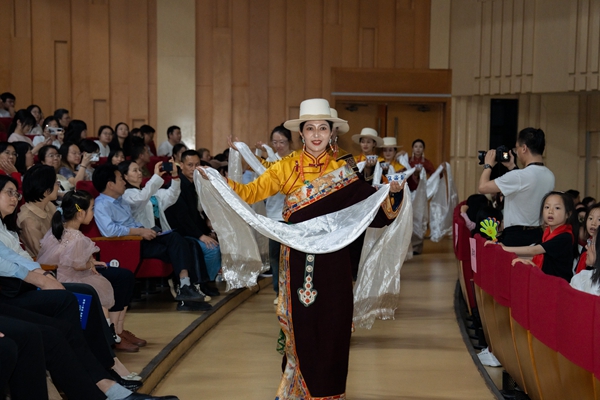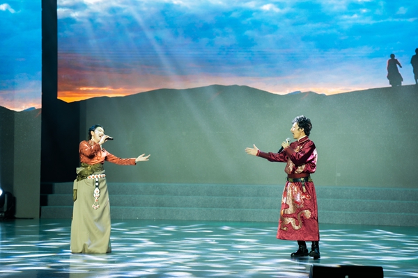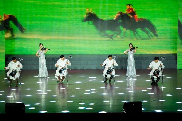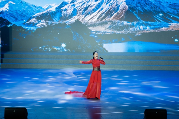 女聲獨(dú)唱《青藏高原》中的女高音清亮動(dòng)人,讓觀眾如身臨其境,感受到海西州震撼人心的高原風(fēng)光。器樂聯(lián)奏《愛在海西》將中西樂器合璧,描繪出海西文化的絢爛璀璨,深情的旋律中盡是海西人民對(duì)家鄉(xiāng)與祖國(guó)的熱愛。群舞《那達(dá)慕盛會(huì)》《弦音鼓舞》融入蒙古族獨(dú)有民俗元素的舞蹈設(shè)計(jì),展現(xiàn)了少數(shù)民族善騎善射、能歌善舞的品質(zhì)。在歌舞《馬背上的民族》中,熱情的高原兒女走下舞臺(tái),將潔白的哈達(dá)和一碗碗酥油茶獻(xiàn)給在場(chǎng)嘉賓,將現(xiàn)場(chǎng)氣氛推向高潮。