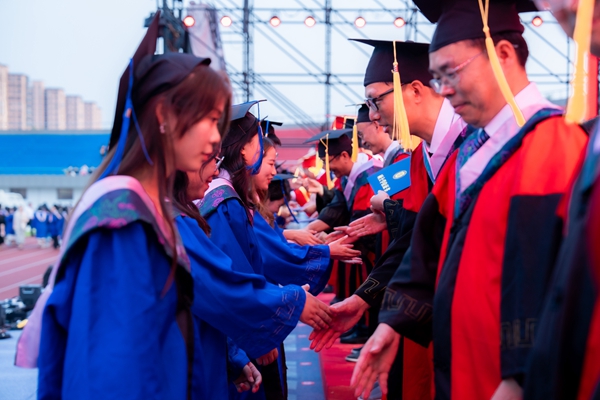 在學(xué)位授予儀式上,校領(lǐng)導(dǎo)班子成員、教師代表為獲得碩士學(xué)位和學(xué)士學(xué)位的學(xué)生正冠撥穗、頒發(fā)學(xué)位證書(shū)并合影留念。
