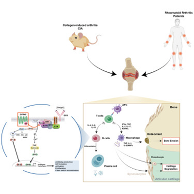 類風濕性關節炎 (RA) 的特征是關節損傷和炎癥,B細胞通過產生自身抗體發揮關鍵作用。在此項研究中,作者團隊發現B細胞中的G蛋白偶聯受體40(GPR40)缺陷會導致活化、增殖、抗體產生、生發中心形成和類別轉換重組增加。GPR40通過與Gαq蛋白結合來調節B細胞受體下游的Plcγ2磷酸化和細胞內鈣通量。在GPR40缺陷小鼠中,對膠原誘導性關節炎的易感性更高。GPR40激動劑顯示出作為治療劑的潛力。而臨床樣本患者樣本的調查中,研究發現GPR40在B淋巴細胞中的表達與RA患者中的疾病發作相關。