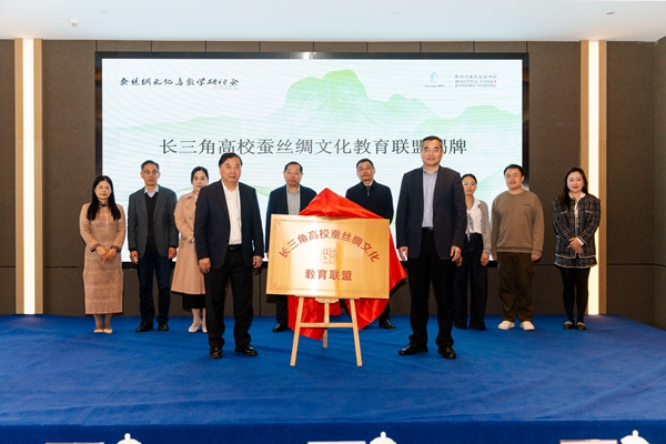 開幕式上,金佩華和姚菊明共同為長三角高校蠶絲綢文化教育聯(lián)盟揭牌。