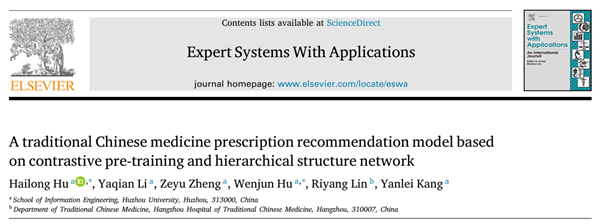 近日,我校信息工程學院智能計算研究所副教授胡海龍老師以第一作者、我校為第一單位在國際著名學術期刊《Expert Systems With Applications》(中科院一區TOP,IF =7.5)上發表題為“A traditional Chinese medicine prescription recommendation model based on contrastive pre-training and hierarchical structure network”的計算機學科與醫學交叉的研究成果,論文通訊作者是信息工程學院胡海龍副教授和胡文軍教授。