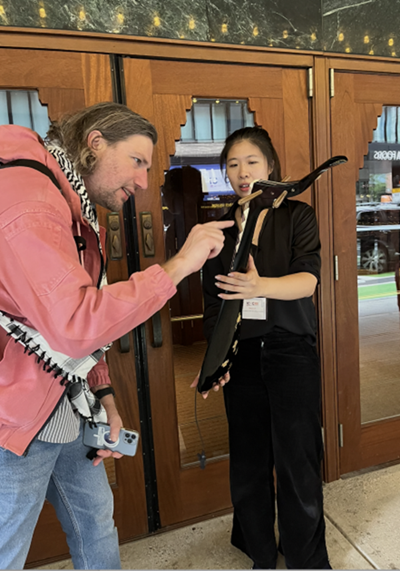 作品首次使用湖州市音聲資源數據挖掘與智能服務技術重點實驗室正在開發的明代魏氏樂琵琶音源“Pipa1617”。作曲家將手機附著在琵琶曲頸上作為數據驅動樂器,結合采樣器和算法復音合成器,對傳統琵琶音色進行了現代化詮釋。在現場,林舒瑜博士還親自演奏了學院于2022年復原的“魏氏樂”琵琶,完成了一場歷史與當代、傳統與先鋒、即興與預置的人機交互式對話。