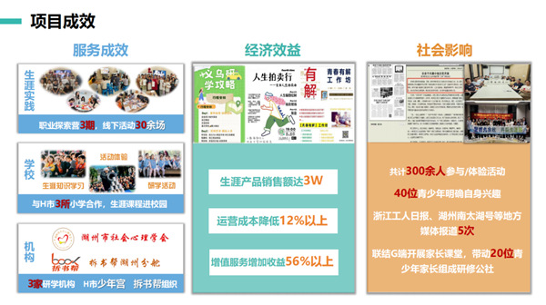 項目成果:該項目經過兩年探索運營,平臺已在浙江省湖州市驗證商業模式可行性:團隊被中華網、浙江工人日報等近十家媒體報道,累計開展30余場線下活動,設計3條研學路線,與斯坦福人生設計教練、青少年宮、湖州市心理協會等機構組織達成合作,共服務500余人次,用戶復購率達65%。