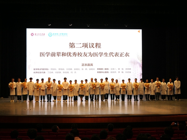 15位來自附屬醫院的醫學前輩、醫學院資深教師以及優秀校友代表,共同為2025級醫學生代表正衣,并贈予醫學生誓言卡,寄托殷切期望。學生代表為15位醫學前輩獻花。