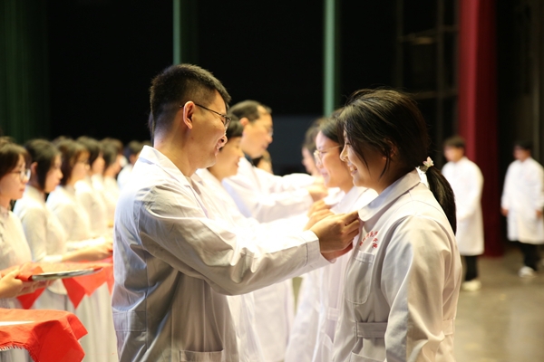 丁敢真代表學校向關心支持醫學教育的各界領導、醫護同仁及校友致謝,向新生致以問候。他指出,白衣加身意味著身份的轉變,前輩為新生扣上“第一??圩印?,是初心與擔當的傳承。他希望新生忠于選擇,將個人理想融入健康中國建設;追求卓越,錘煉過硬醫術;勇于突破,擁抱時代變革,做醫學疆域的“拓荒者”。
