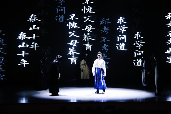 話劇《胡瑗》全劇分為三幕,以說書人的念白引出胡瑗先生一生的幾個重要階段,生動呈現(xiàn)了胡瑗先生的求學(xué)、教書與育人經(jīng)歷。該劇不僅藝術(shù)化地闡釋了胡瑗先生所倡導(dǎo)的“明體達(dá)用”教育思想及其創(chuàng)立的“分齋教學(xué)”教育制度,更充分彰顯了他堅韌不拔的治學(xué)精神與前瞻開放的教育理念。今年,《胡瑗》在去年劇本的基礎(chǔ)上進(jìn)一步創(chuàng)新,著重改進(jìn)了說書人的臺詞表達(dá),使其更貼近青年的語言習(xí)慣與觀察視角,力求打造一部更能引起當(dāng)代大學(xué)生共鳴的話劇作品。