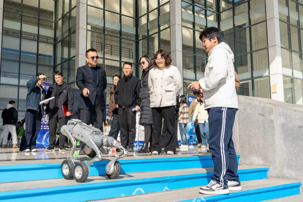開(kāi)幕式結(jié)束后,師生移步至31幢二樓平臺(tái),參觀豐富多彩的AI科技互動(dòng)展覽。現(xiàn)場(chǎng)設(shè)有成果展區(qū)、實(shí)物展區(qū)與黨建AIGC紅色影像作品展。智能機(jī)器狗、采摘機(jī)器人、機(jī)械臂等設(shè)備一一亮相,學(xué)生負(fù)責(zé)人細(xì)致講解研發(fā)過(guò)程與技術(shù)特點(diǎn),引發(fā)熱烈討論。AI陪伴機(jī)器人展區(qū)也吸引了眾多師生駐足互動(dòng),現(xiàn)場(chǎng)氣氛活躍。